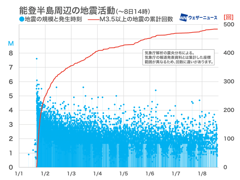 能登半島周辺で2020年から続いている地震活動では、これまでの最大は2023年5月5日のM6.5 最大震度6強の地震でしたが、今回のM7.6の地震はその40〜50倍程度のエネルギーということになります。日本周辺で発生した地震でみても、深発地震を除けば2011年3月の東北地方太平洋沖地震の一連の活動以来の規模といえます。