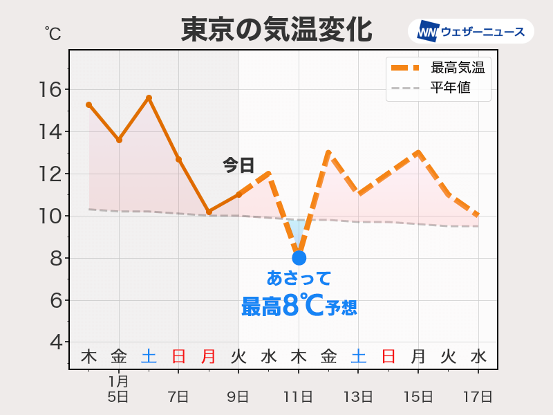 寒さも強まったり緩んだりを繰り返し、関東もあさって11日(木)は気温が上がらず、平年の最も寒い時期の寒さになりそうです。
