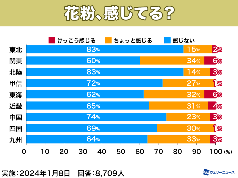 また、花粉を感じている方の割合が最も多かったのは関東で40%。次いで多かった東海で38%と、花粉症とみられる症状が多くの方に現れています。