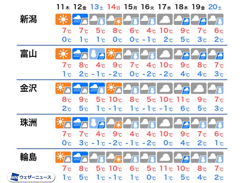 明後日12日(金)は前線が通過する影響で早くも天気が崩れ、寒気が南下する13日(土)は雪に変わる所があります。