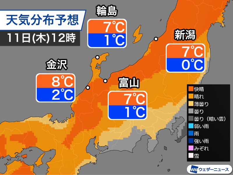 明日11日(木)は高気圧に覆われるため、朝から晴れる所が多くなります。風もそれほど強くは吹かないため、復旧作業などを進めるチャンスです。