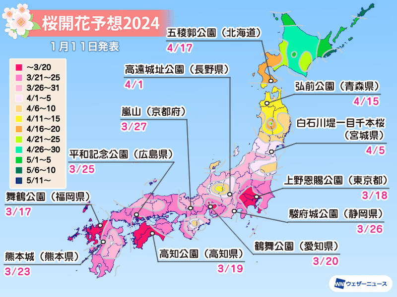 各地とも平年より早く、東京は3月17日予想