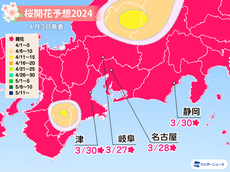 東海の桜の開花は3月27日に岐阜からスタートしました。30日には静岡・ 津で開花し、全ての都市で開花を迎えています。今年は平年並から平年より遅い開花となり、静岡では平年から6日遅れて開花しました。先週は週後半から気温が上がりました。特に週末は20°Cを超えて季節を先取りしたような暖かさとなり、桜の開花が一気に進みました。