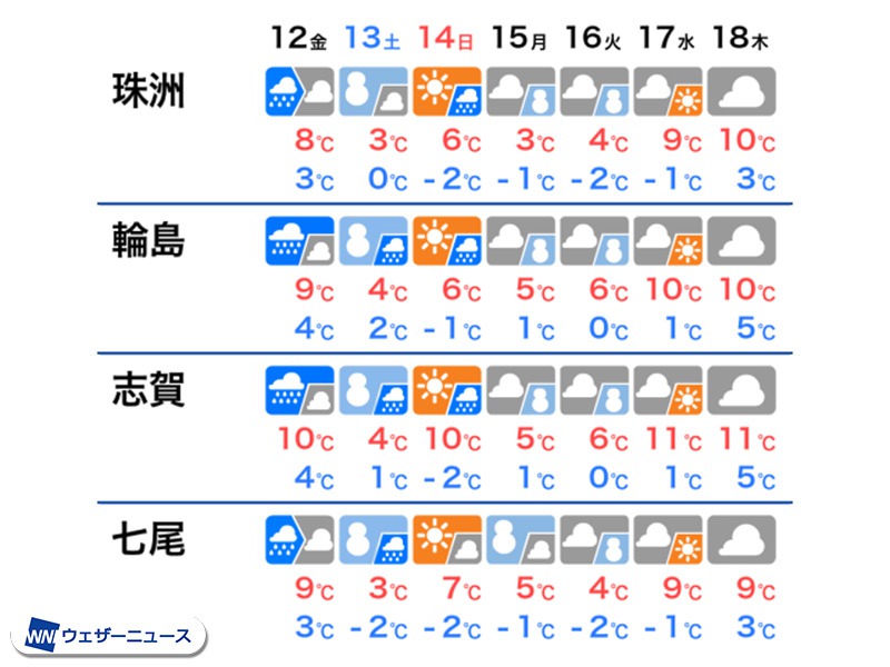 14日(日)から15日(月)にかけては低気圧が発達しながら北海道の北へ進み、週明けは再び西高東低の冬型の気圧配置となります。強い寒気が南下するため、北海道から山陰にかけての日本海側を中心に雪や雨が降る予想です。特に、16日(火)は北陸や北日本日本海側を中心に大雪や吹雪に警戒が必要です。