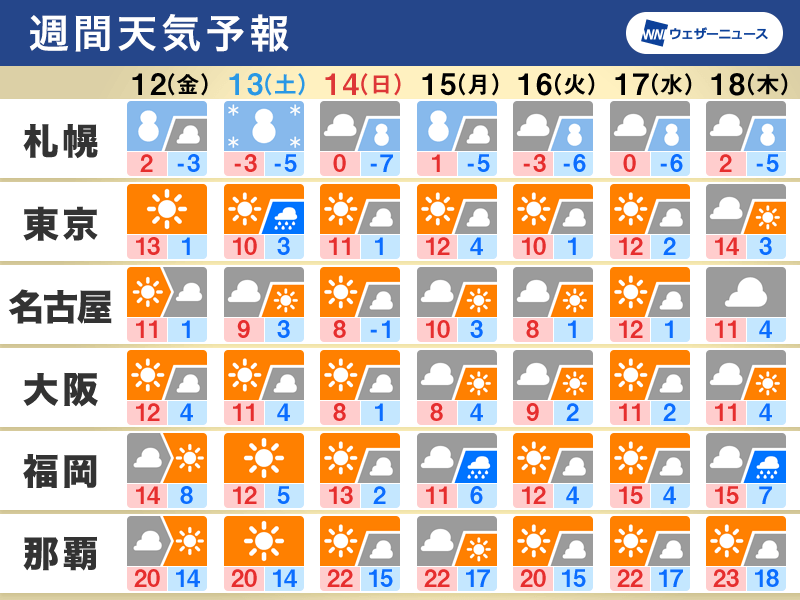 明日12日(金)には低気圧が北日本を通過し、13日(土)には北日本を中心に西高東低の冬型の気圧配置となります。