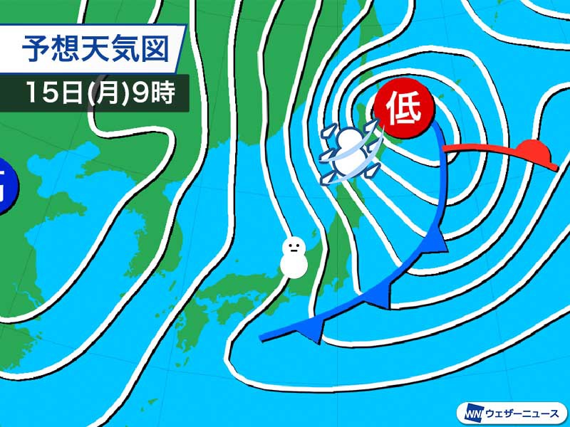 14日(日)に日本海を進む低気圧は、15日(月)にかけて急速に発達しながら北海道付近を通過する予想となっています。西からは高気圧が張り出して、次第に冬型の気圧配置が強まる見込みです。