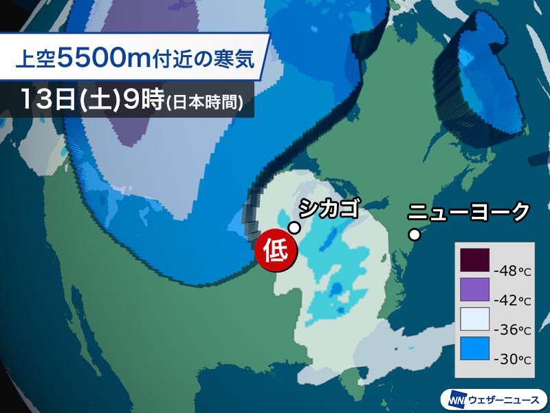 日本時間の今日13日(土)の朝、低気圧が発達しながらアメリカの五大湖周辺を通過中です。