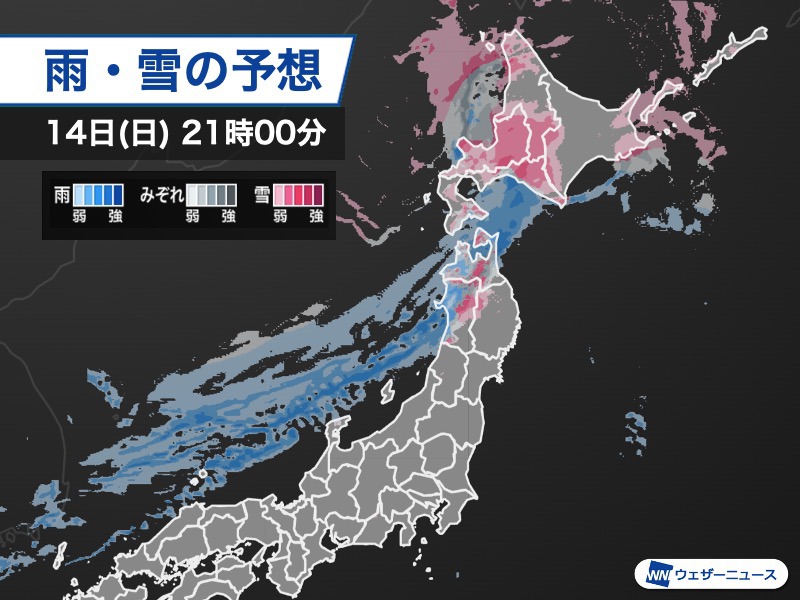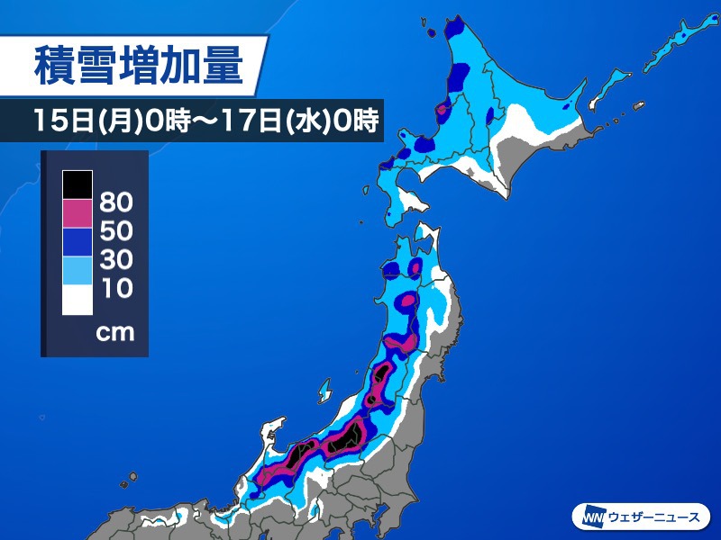 寒冷前線は明日15日(月)の朝にかけて本州を通過し、通過後は16日(火)にかけて冬型の気圧配置となります。日本列島の上空には強い寒気が流れ込んで、日本海側の地域では雪が降り、特に北日本や東日本では短時間強雪や大雪による積雪の急増に警戒が必要です。
