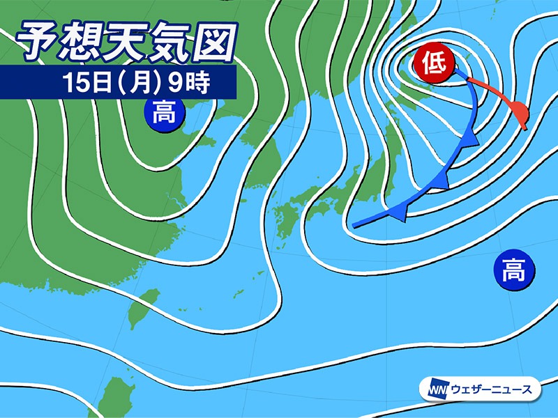 明日15日(月)は冬型の気圧配置となり、強い寒気が流れ込みます。日本海側を中心に雪が降り、特に北日本や東日本は大雪や猛吹雪に警戒が必要です。能登半島地震の被災地 北陸では災害の発生や拡大にも注意してください。