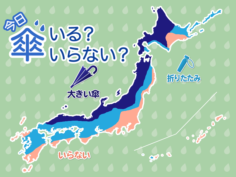北海道の道南太平洋側や東北太平洋側の内陸は、雪や雨の降ることがある見込みです。東海や西日本でも午前中はにわか雨があり、山沿いでは雪になるところがあります。外出には折りたたみ傘があると安心です。