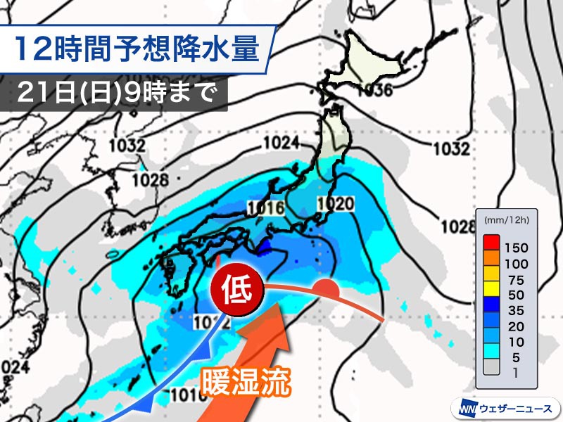 明後日18日(木)頃からは日本付近に前線が停滞しやすく、週末にかけて太平洋側でもすっきりしない天気となります。特に21日(日)頃は前線上に低気圧が発生して、発達しながら進む影響で、雨や雪の降る所が多くなる見込みです。