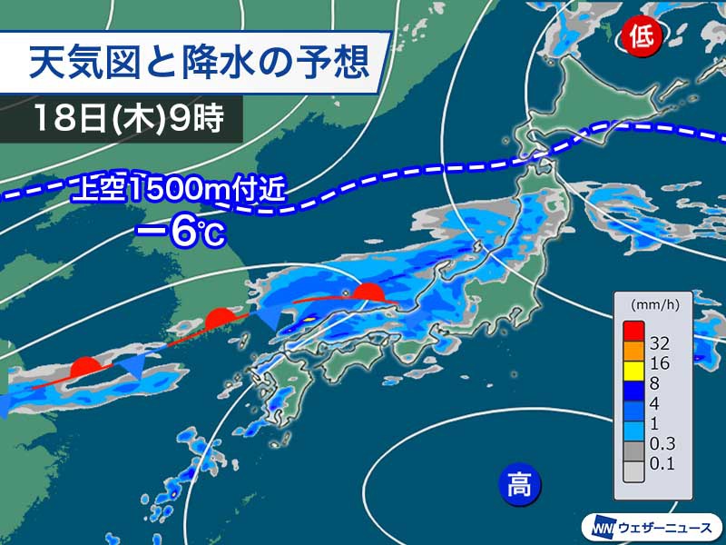 今日17日(水)は冬型の気圧配置が弱まって、日本海側を含む広い範囲で日差しが届いています。ただ、この晴天は長くは続かず、明日18日(木)は雨や雪の降る所が多い予想です。