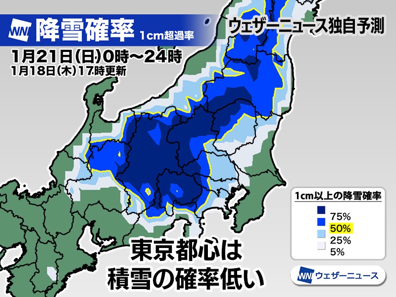 21日(日)は関東甲信で雪の可能性 東京23区などは積雪の確率は低め