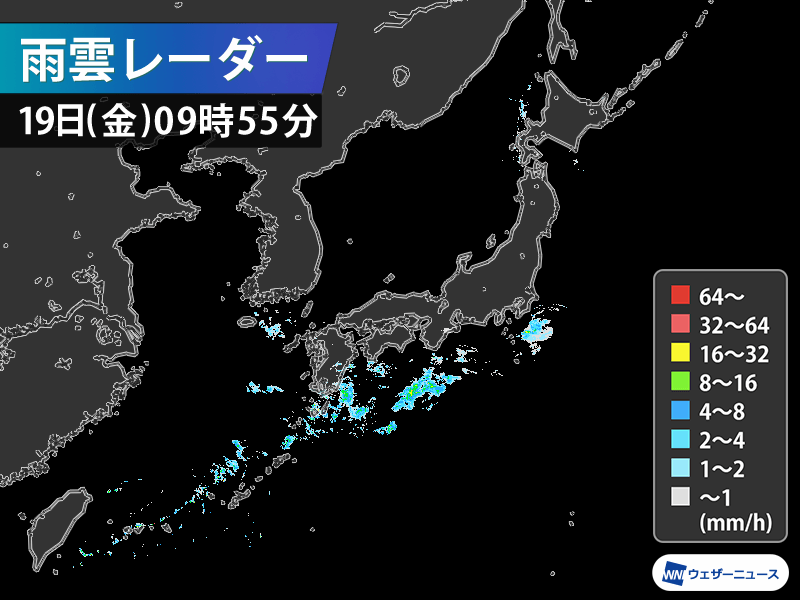 西日本では局地的にパラパラと雨が降っていて、九州南部や南西諸島では前線本体の雨雲がかかって一時的に雨が強まっているところもあります。沖縄県では局地的に1時間で10mmを超えるやや強い雨を観測しています。