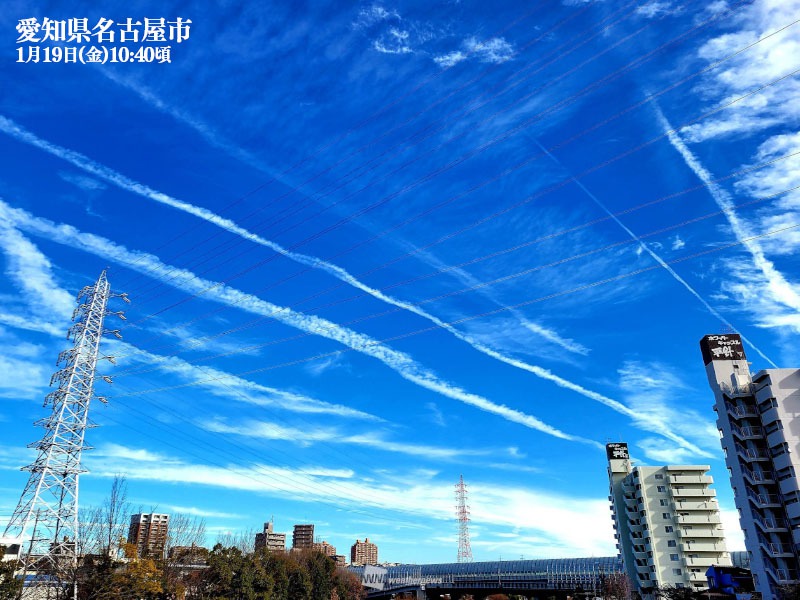 氷の粒でできた飛行機雲は、空気が乾いているときはすぐに周囲の空気と混ざって消えますが、上空が湿っているときは長い時間にわたって残ります。飛行機雲が何本も長時間残っているのは、青空が広がっていても上空の湿度が高くなってきた証拠となります。
