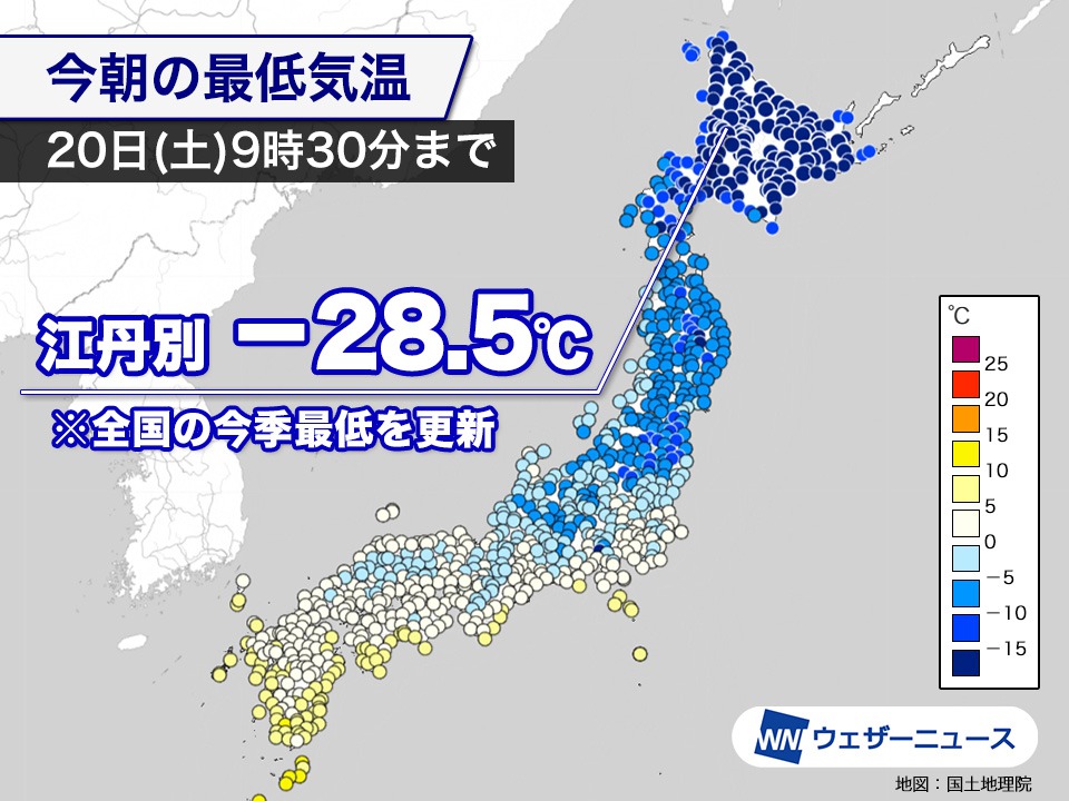 江丹別の-28.5℃は、今月11日(木)に陸別で観測された-27.1℃を下回って今季全国最低気温を更新しました。