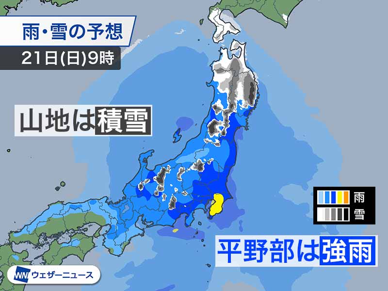 関東では千葉県や茨城県を中心に、一時的に土砂降りの雨となったり落雷を伴う可能性があります。雪の影響はないにしても、お出かけにはあいにくの天気です。