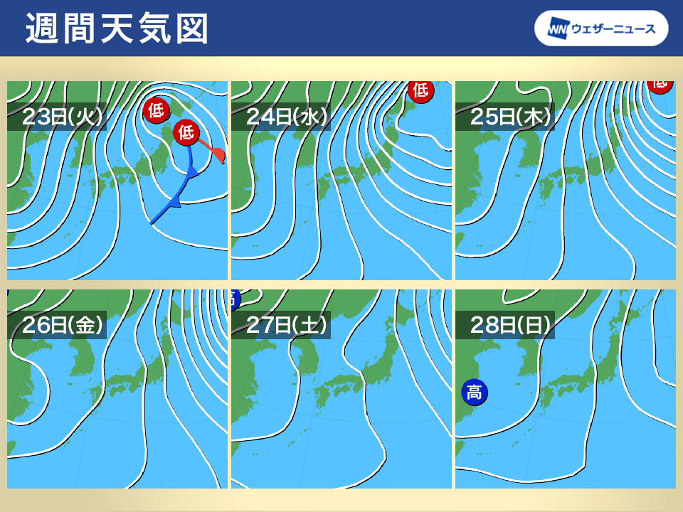 23日(火)頃〜25日(木)頃にかけて冬型の気圧配置が強まり、強い寒気が流れ込むため日本海側では大雪に警戒が必要です。太平洋側にも雪雲が流れ込む可能性があります。