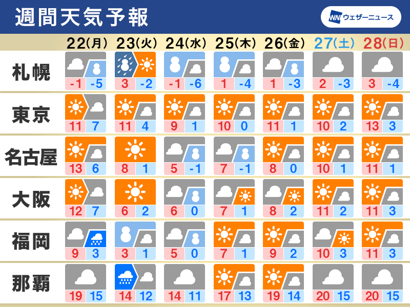 24日(水)は大阪で最高気温が6℃、名古屋や福岡では5℃の予想となっています。平年の最も寒い時期を下回る極寒の一日となるため、防寒を万全にして体調を崩さないようお気をつけください。