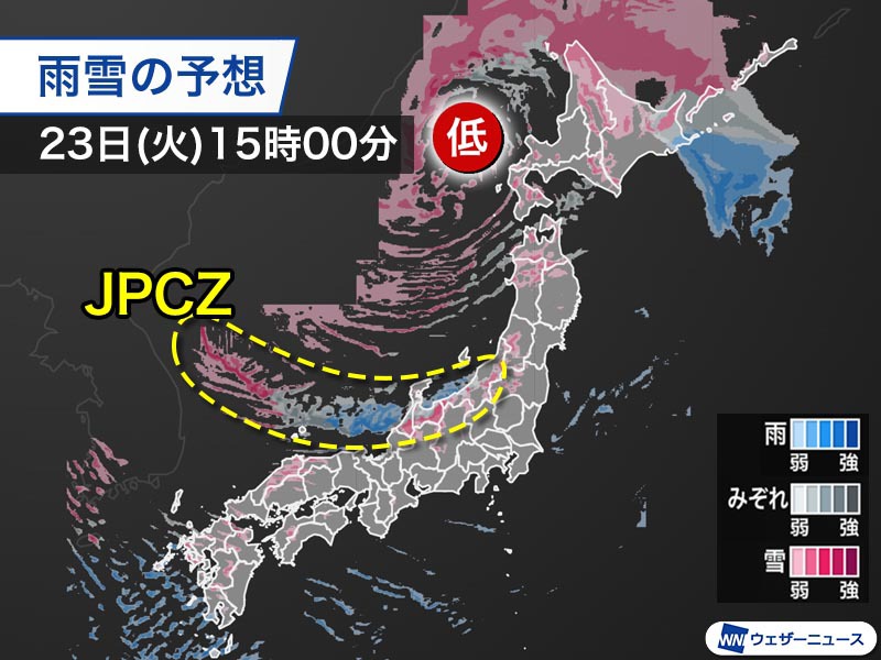 明日23日(火)は日本海にJPCZ(日本海寒帯気団収束帯)に伴う活発な雲の帯が形成され、この雲が北陸地方に伸びるため断続的に雪が降る見通しです。局地的には1時間に5〜10cmの強い雪となって積雪が急増。路面状況が悪化し、物資の輸送が滞るなど被災地への影響が大きくなる可能性があります。