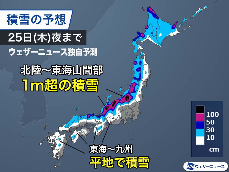 明日から25日(木)夜までの積雪増加量は、最も多くなる北陸の山間部で100cmを超える所があり、北海道から東北、北陸の山沿いでは広い範囲で50cm以上に達する予想です。近畿北部や山陰でも覆い所では30cm以上の積雪が見込まれ、各地で今季一番の大雪になるとみられます。