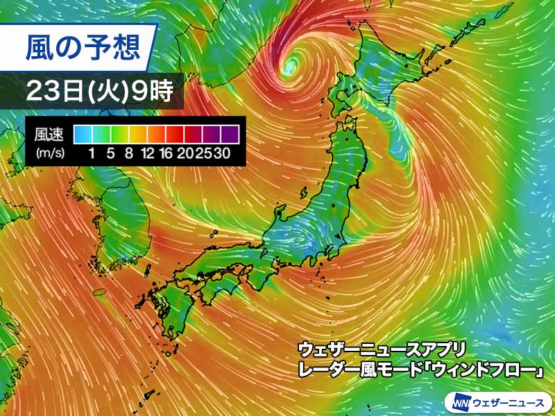 明日は西日本の各地で北西の風が強く平均で15m/s前後に達する所が多くなる予想です。北海道は日本海北部の低気圧の影響を受け、特に宗谷地方では東寄りの風が平均で20m/s前後に達する可能性があります。