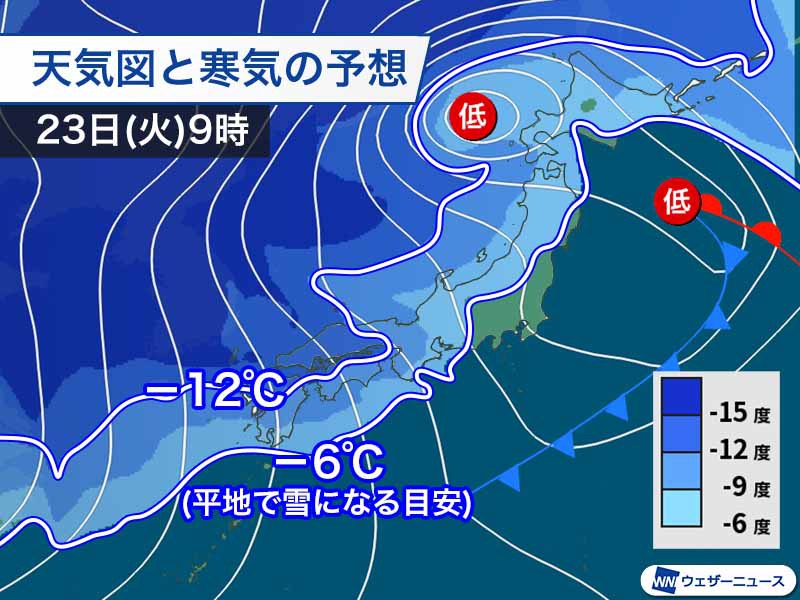 明日23日(火)の朝には西から冬型の気圧配置が強まり、平地で雪を降らせる目安の上空1500m付近で−6℃以下の寒気は西日本の太平洋側まで、さらに強い−12℃以下の寒気が九州北部から中国地方の大部分を覆う見込みです。