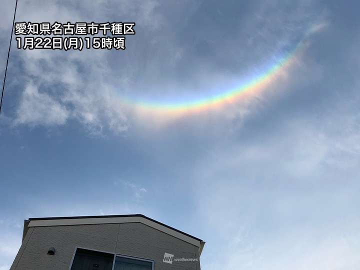 名古屋市など愛知県内は日没頃まで薄雲がかかりやすく、環天頂アークが見えなくなった後も、そのほかの虹色現象が現れるかもしれません。