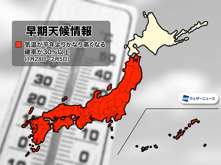 来週中頃は西日本や東日本の広い範囲で最高気温が15℃を超える日があり、東北でも10℃を上回るくらいとなる予想です。エルニーニョ現象の影響などでこの冬は寒気の流入が続かず、ここまでは暖冬傾向となっています。明日からの寒波も一時的で、2月にかけても寒暖の変化を繰り返すパターンになる見通しです。