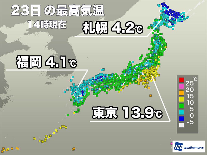 関東や北日本は寒気の影響が小さいため気温は高めで、東京都心は13.9℃、札幌市は福岡市よりも高い4.2℃まで上がっています。