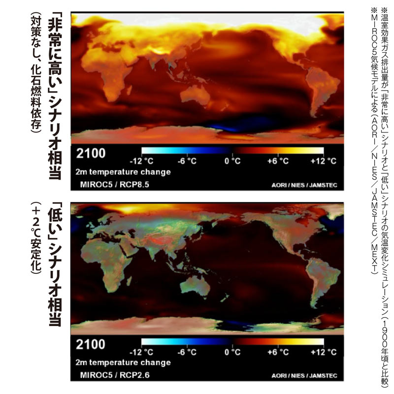 一方、世界の平均気温の上昇を2℃未満に抑える対策を講じた場合は、2050年くらいの気温に踏みとどまることができると考えられています。