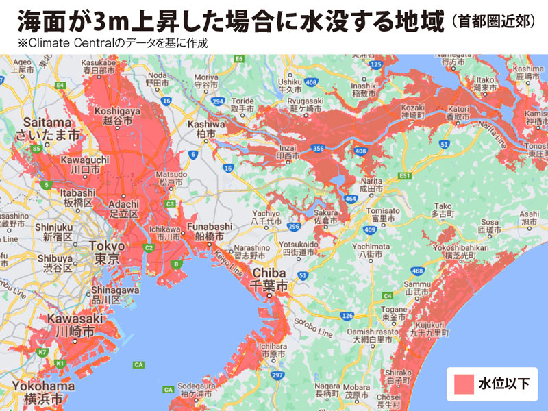 南極大陸などの氷の融解が進み、海面が仮に3m上昇した場合、首都圏などでは水没する地域がたくさんあります。