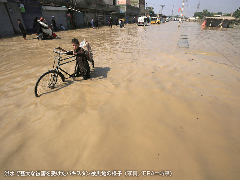 一例として、2022年8月にパキスタンで起きた大洪水を挙げることができます。この大洪水によって、パキスタンの国土の約3割が浸水などの被災をしました。
