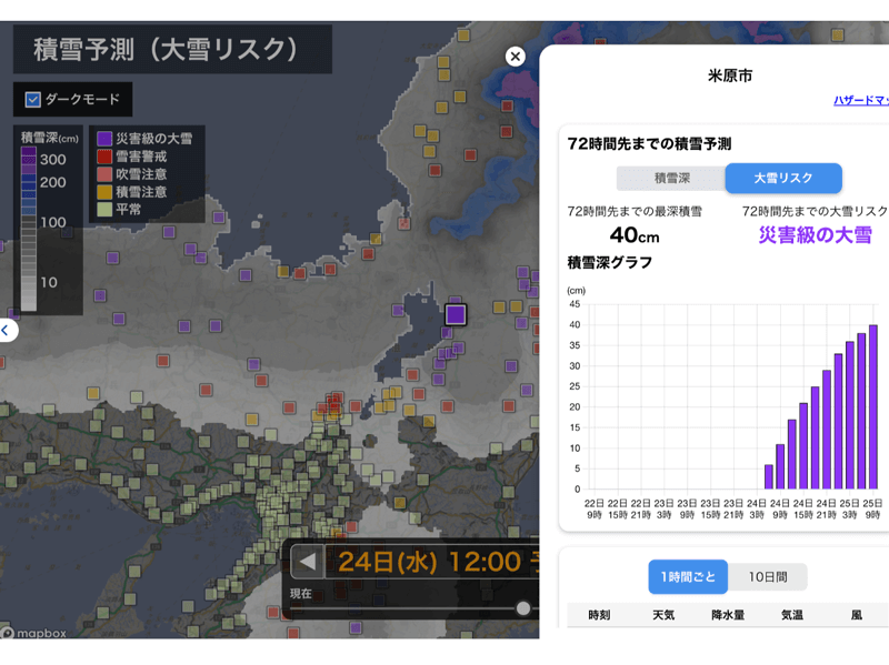 上記のマップとグラフはウェザーニュース for businessの積雪予測(大雪リスク)です。22日(月)9時の時点で、滋賀県米原市の積雪が24日(木)には災害級レベルの大雪になることを予測していました。