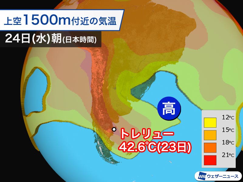 アルゼンチンは大西洋南部に中心をもつ優勢な高気圧に覆われています。高気圧の周囲を吹く風が暖かな空気を送り込んでいるため、南部を中心に連日、厳しい暑さとなっていて、一部では40℃を上回るほどです。