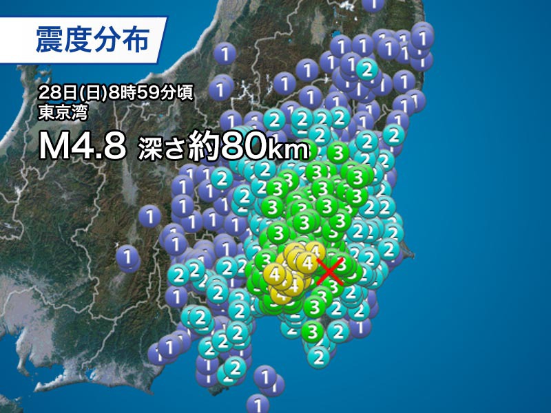 28日(日)8時59分頃、東京湾を震源とするマグニチュード4.8、深さ約80kmと推定される地震が発生しました。この地震で東京都中央区、港区、渋谷区、調布市、町田市、神奈川県横浜市、川崎市などで最大震度4、関東の広範囲で震度3の揺れを観測しています。