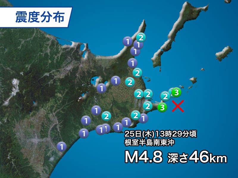 25日(木)13時29分頃、根室半島南東沖を震源とするマグニチュード4.8、深さ46kmと推定される地震が発生しました。この地震で北海道根室市で最大震度3、浜中町や標茶町、羅臼町、別海町などで震度2の揺れを観測しています。