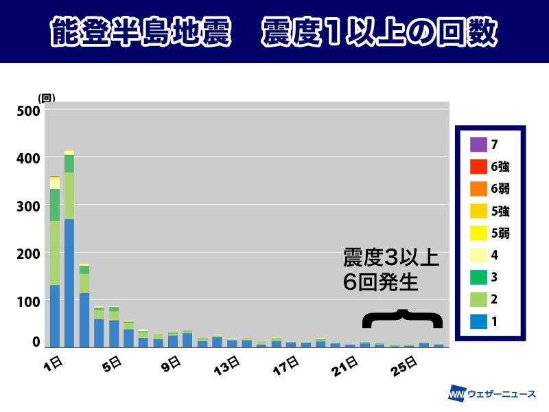 能登半島地震の余震活動は有感地震が1日辺り10回前後で推移していて、震度3以上の地震は1週間で6回発生しました。