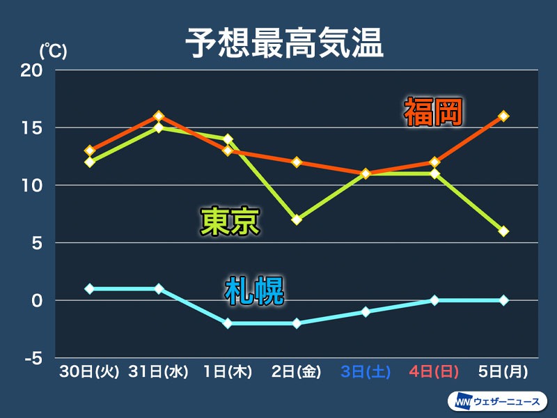 寒気はあまり南下しないため、九州や四国では影響が小さくなる見込みです。福岡市の最高気温は15℃前後まで上昇する日があります。この時期の平年の気温は10℃くらいですので、ほとんどの日が平年を上回る見込みです。