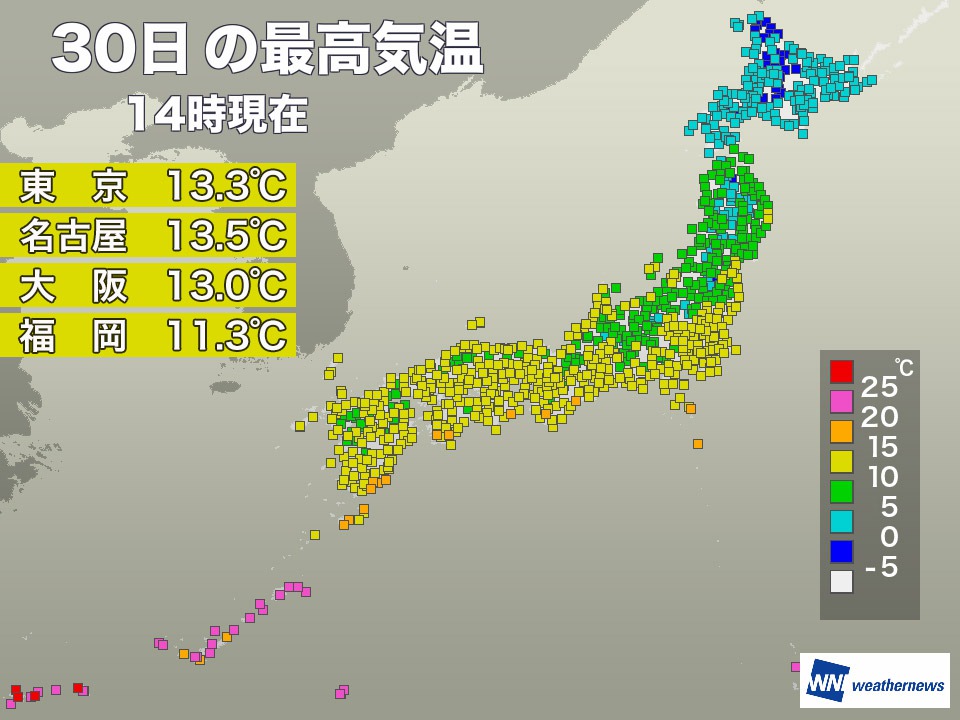 14時までの最高気温は、東京13.3℃、名古屋13.5℃、大阪13.0℃、福岡11.3℃と、都市部では10℃を超え引き続き厳しい寒さはなく、各地で朝と日中の寒暖差が大きくなっています。