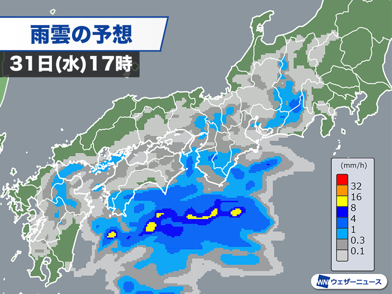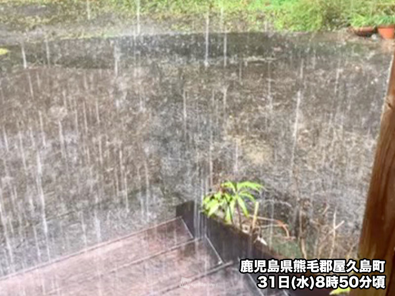 今日31日(水)は東シナ海からのびる前線が接近し、九州の広範囲で雨が降っています。特に種子島・屋久島地方でやや強い雨となりました。
