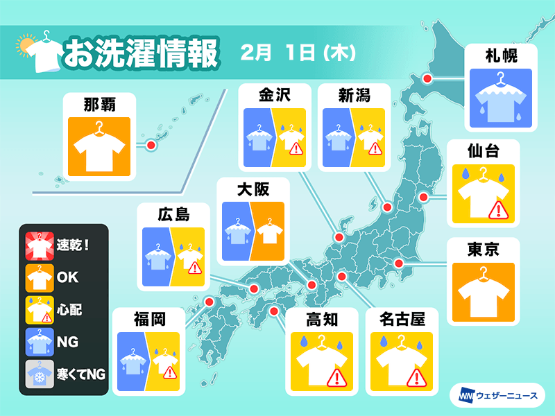 北陸や北日本日本海側も雪や雨が降りやすく、外干しには不向きな天気が続きます。北日本太平洋側もにわか雨の可能性があるので、外出する場合は取り込んでからの方が安心です。
