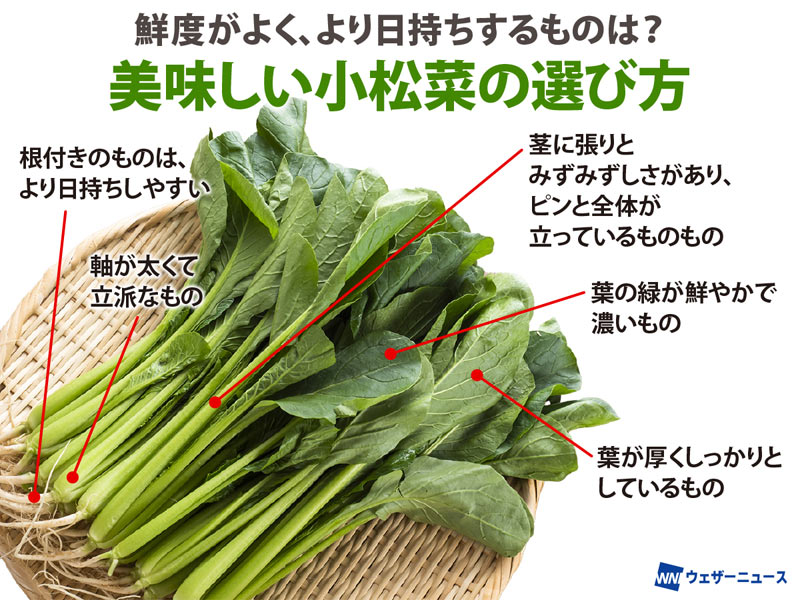 また、この時季になると多く出回る根付きの小松菜は、より日持ちしやすいです。軸が太くて立派なものが多く、軸のシャキシャキとした食感が楽しめます。