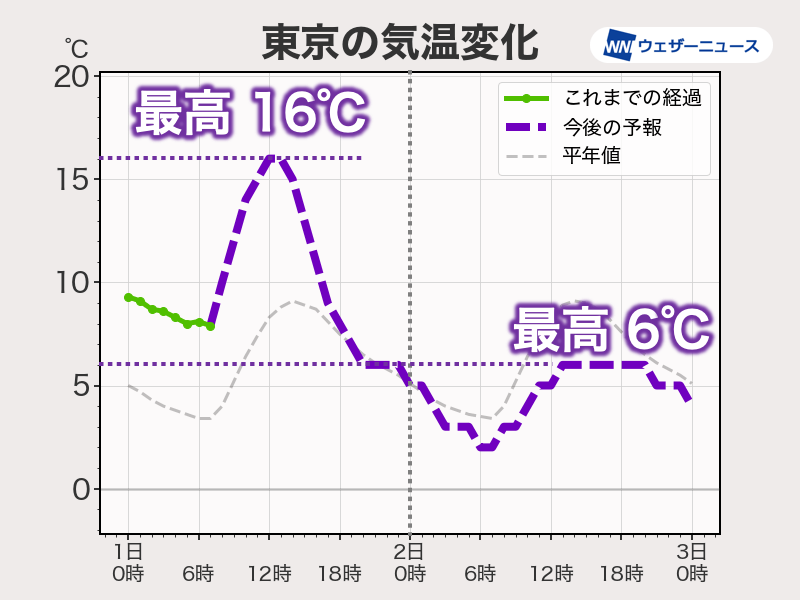 ただ、明日になると気温が急降下し、東京都心の最高気温は6℃と真冬並の寒さに逆戻りします。