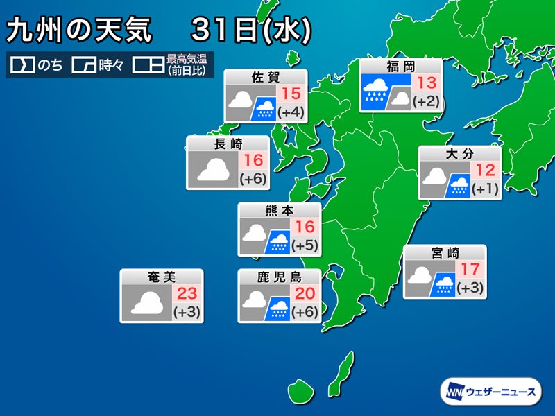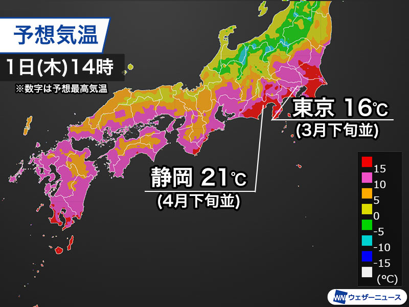 昼間はやや雲が多いものの暖かい空気に包まれるため、予想最高気温は東京都心、横浜、千葉はいずれも16℃です。
