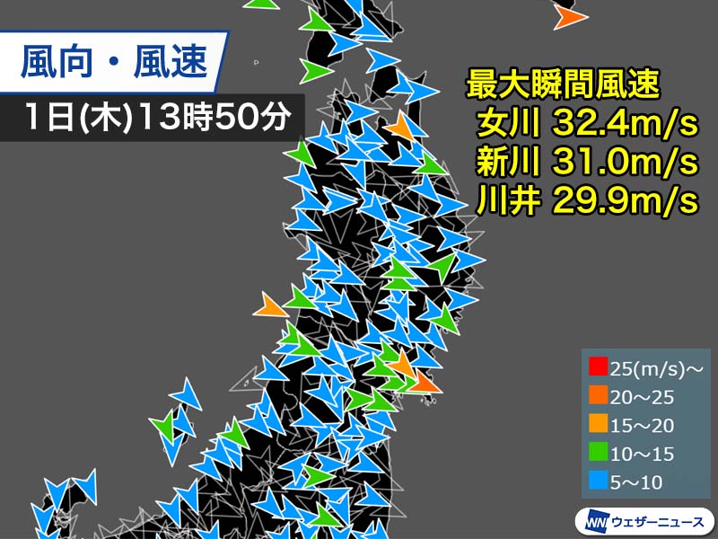 平均風速が15m/sを超えている所があり、13時50分までの最大瞬間風速は、宮城県女川町で32.4m/s、仙台市・新川で31.0m/s、岩手県宮古市・川井で29.9m/sを観測。宮城県、岩手県には暴風警報が発表されています。
