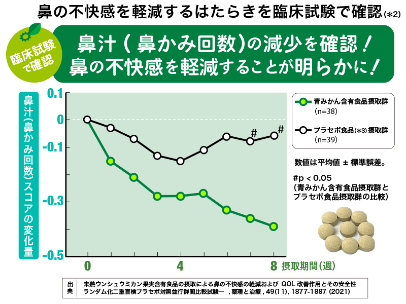 *2:【試験方法】ハウスダストなどにより日ごろから鼻や目に不快感があるが、服薬治療を行っていない20歳以上64歳以下の成人男女80人を対象者とし、本品摂取群とプラセボ食品摂取群に分け、毎日8週間摂取。QOL調査票・不快感日誌の記録に準じ、症状および不快感スコアにより比較評価。【主な結果】有効解析対象者77人(本品摂取群38人、プラセボ食品摂取群39人)を対象に解析した結果、本品摂取群は、不快感日誌「鼻汁(鼻かみ回数)」スコアの変化量において、7週目および8週目にプラセボ食品摂取群と比較して有意な減少がみられ、本品の継続的な摂取により、鼻の不快感が有意に軽減されていることが明らかになりました。
