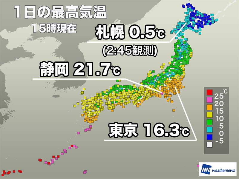 西日本から東日本の太平洋側には暖かな空気が残って気温が高めとなり、日差しが届いた関東や静岡を中心に最高気温が15℃を上回っています。静岡市では最高気温が21.7℃と今年初めて20℃を超え、東京都心も16.3℃と約2週間ぶりの15℃以上です。