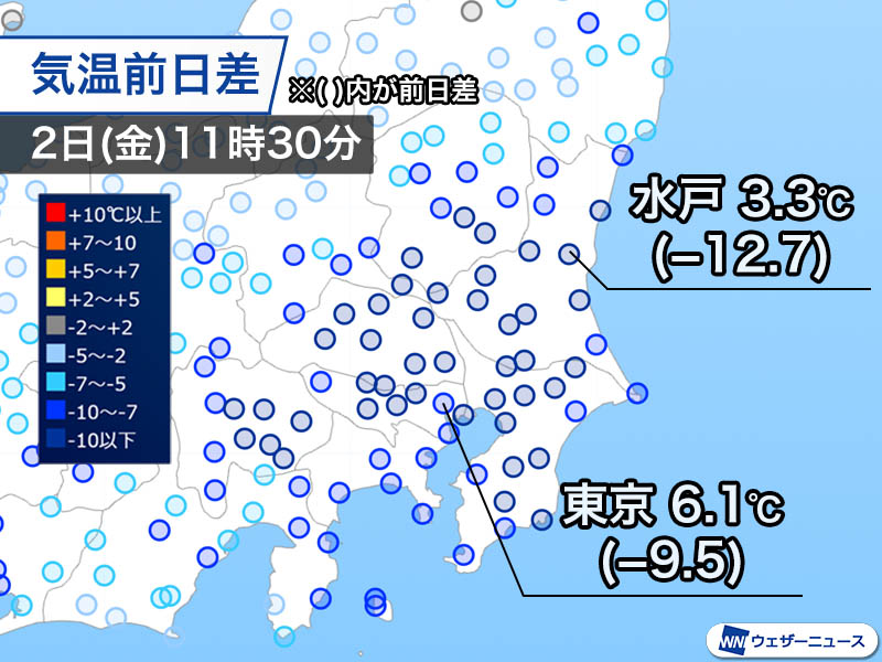 11時30分の時点で、昨日の同じ時間帯よりも10℃以上低い所が目立っていて、東京都心は9.5℃低い6.1℃、千葉市は11.0℃低い4.4℃、水戸市は12.7℃低い3.3℃しかありません。
