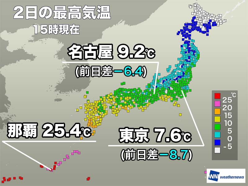 15時までの最高気温は東京都心で昨日より8.7℃低い7.6℃までしか上がっていません。名古屋市も9.0℃と一桁で、昨日よりは6.6℃低くなりました。